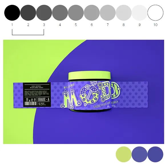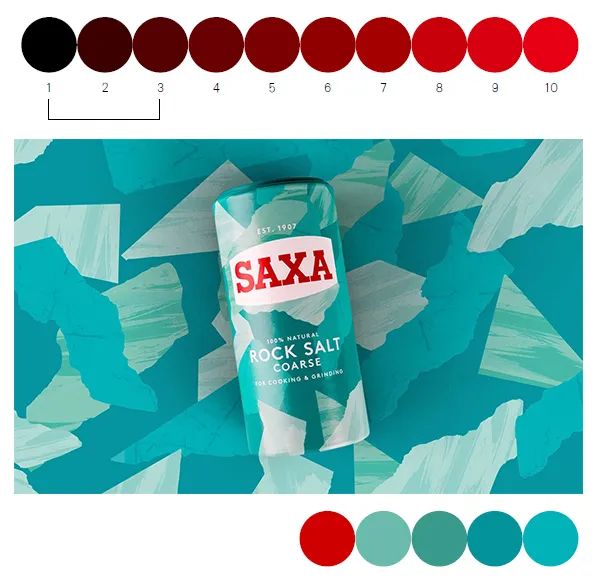 4~6個(gè)色階間的飽和度差的顏色對(duì)比是飽和度中對(duì)比。這種對(duì)比傳遞含蓄、溫和的感覺(jué),在這種對(duì)比下的形象會(huì)有更高的可視度,畫(huà)面看起來(lái)也更加有活力,因此,飽和度中對(duì)比在設(shè)計(jì)中很常見(jiàn)。