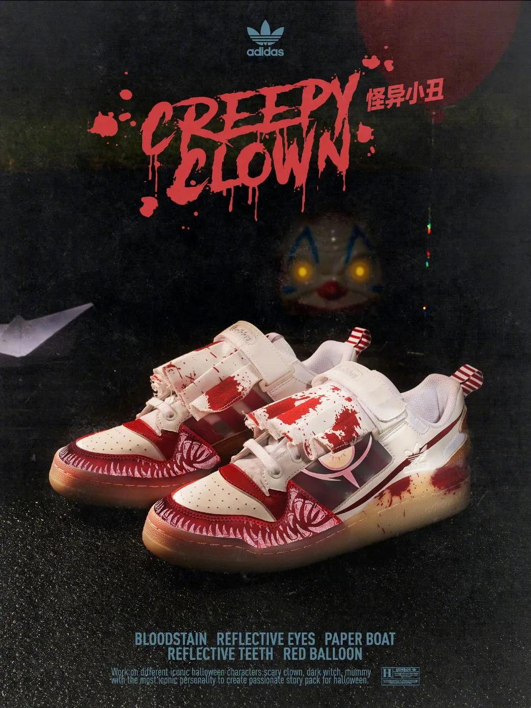 當(dāng)然一些品牌商家們還是會(huì)借勢搶占市場、搶奪眼球。比如adidas出品了Originals Halloween系列,進(jìn)入阿迪首頁就滿滿的恐怖氛圍。阿迪這次的萬圣「心動(dòng)」體驗(yàn)系列可謂是主題感、氛圍感十足,再加上復(fù)古恐怖風(fēng)格的海報(bào)設(shè)計(jì)。讓我們一起來欣賞一下:小丑面龐反光呈現(xiàn),“鞋”惡獠牙布滿鞋身
