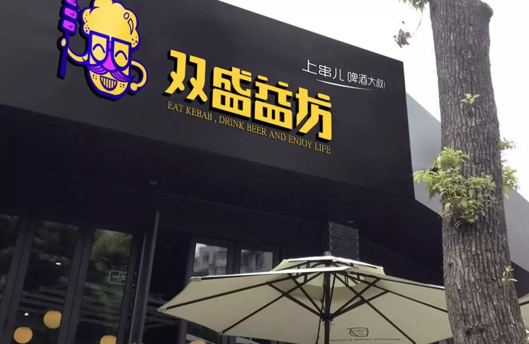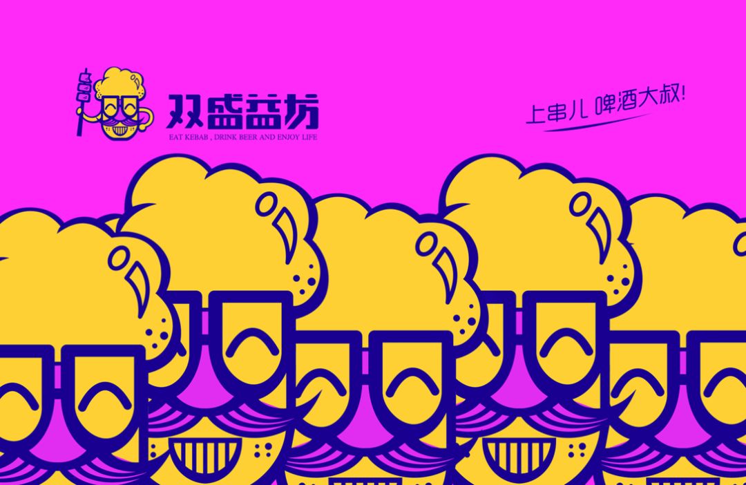 其黑色的招牌底搭配亮眼的黃色,使品牌更顯年輕有活力,slogan“上串兒,啤酒大叔”,親切的語氣凸顯了品牌與顧客的親近感。主視覺形象的設(shè)計(jì)融合了烤串+啤酒+大叔,啤酒和胡子大叔的矢量輪廓完美地結(jié)合,營(yíng)造出幽默有趣且嘻哈風(fēng)的啤酒大叔形象,通過墨鏡與胡子拼接成“雙”字,呼應(yīng)了品牌名稱“雙盛益坊”。大膽地使用黃、紫對(duì)比色作為品牌主色調(diào),造成吸睛的視覺效果,且突出LOGO形象,筆畫粗細(xì)的變化豐富了主視覺形象,使其變得更有層次感。