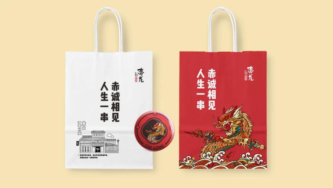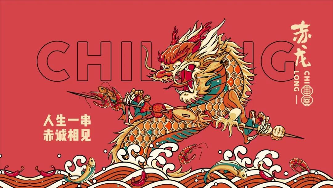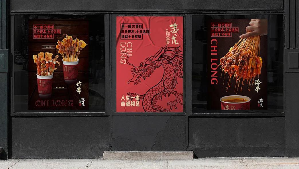 這個(gè)炸串品牌叫赤龍炸串,圍繞赤龍的品牌名,原創(chuàng)手繪出一條翻江倒海,爪持串物的龍形象。LOGO設(shè)計(jì)是中文字體和拼音的結(jié)合,赤龍二字用毛筆揮斥而成,赤龍的拼音在和串屋二字連結(jié),重在突出赤龍的品牌名稱。輔助圖形采用日式匠心經(jīng)典“燒鳥”造型,結(jié)合本地傳統(tǒng)炸串,演繹誕生出新一代解饞美味。