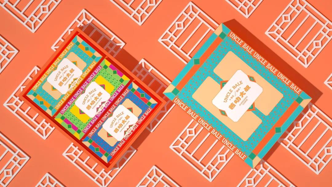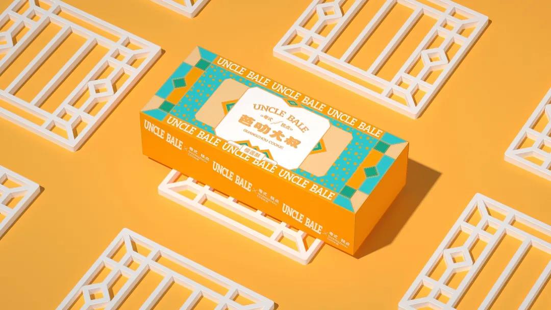 這款糕點(diǎn)采用高飽和度的暖色調(diào)設(shè)計(jì),輔以封面中的幾何圖形撞色搭配,扁平化的形式勾勒了經(jīng)典窗格的紋路元素,視覺上更具異域風(fēng)情。居中排版的LOGO以徽標(biāo)呈現(xiàn),金色描邊搭配趣味的中英文字體設(shè)計(jì),平衡整體視覺美感的同時(shí),增強(qiáng)消費(fèi)者對(duì)產(chǎn)品的好奇心理。