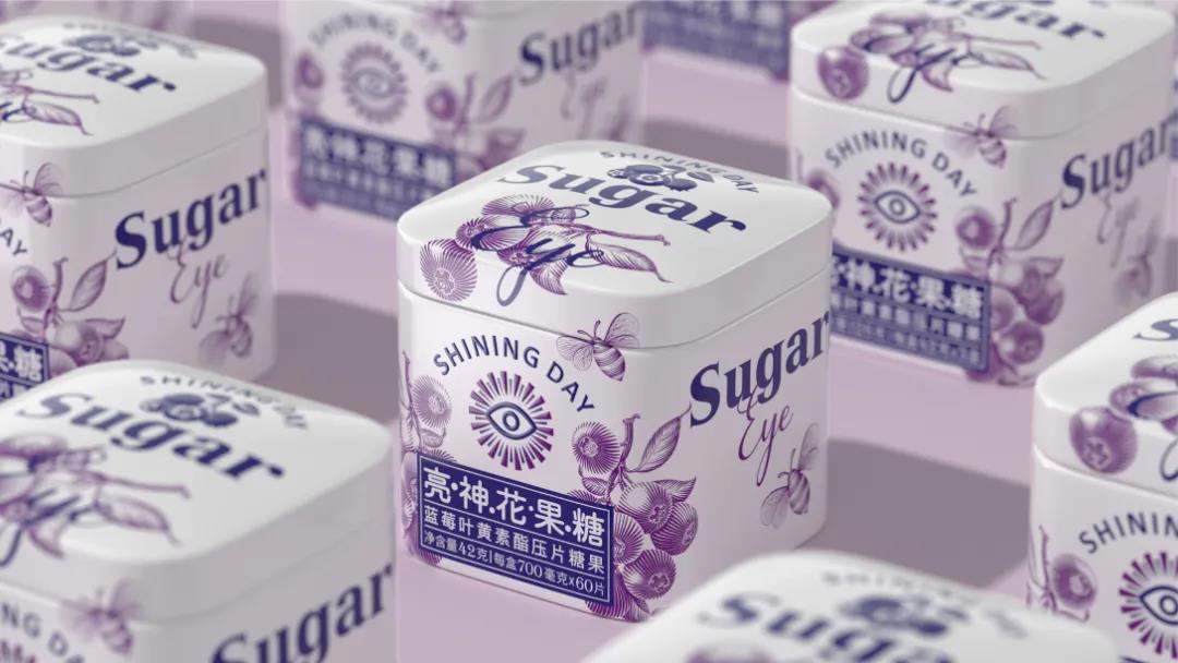 鐵罐盒的小巧包裝方便用戶隨時(shí)攜帶,另外在琳瑯滿目的貨架陳列上,結(jié)合整潔清爽的畫面設(shè)計(jì),用戶也能迅速捕捉鐵罐的糖果屬性,進(jìn)一步突出產(chǎn)品的健康、優(yōu)質(zhì)。外盒包裝延續(xù)一致的風(fēng)格,居中排版的人眼睛巧妙結(jié)合了太陽元素,如同正放射光芒的熾烈陽光,突出了產(chǎn)品“護(hù)眼”的功能屬性,進(jìn)一步強(qiáng)化人們對(duì)“保健類”糖果的印象。