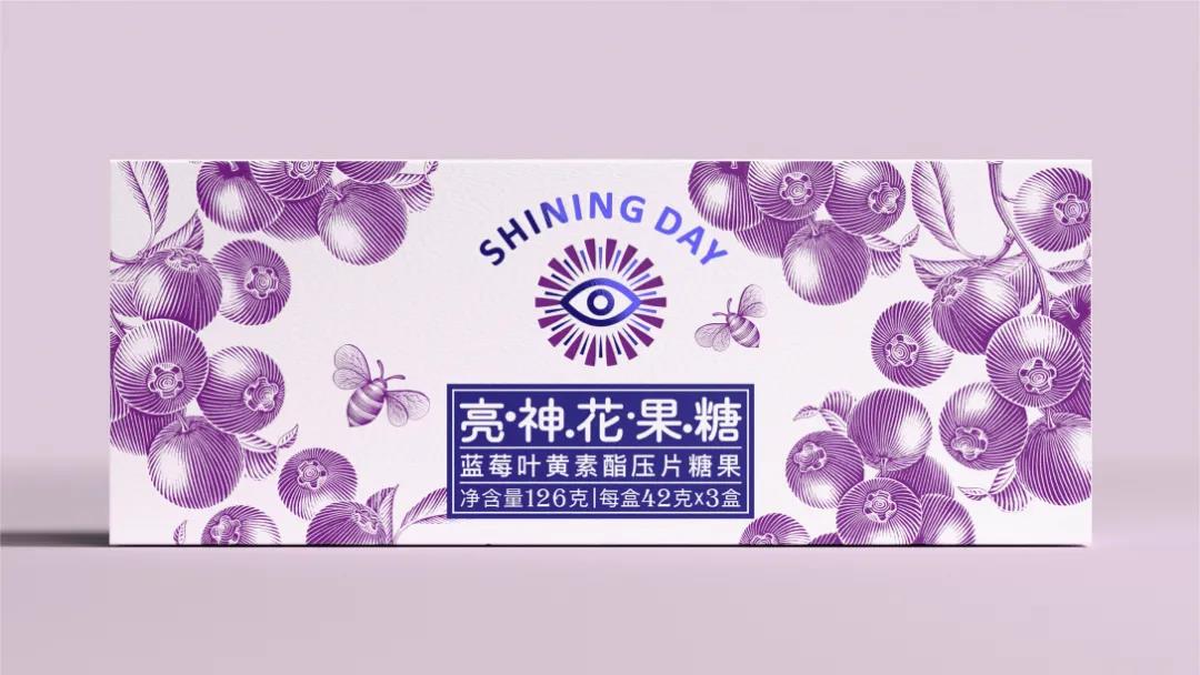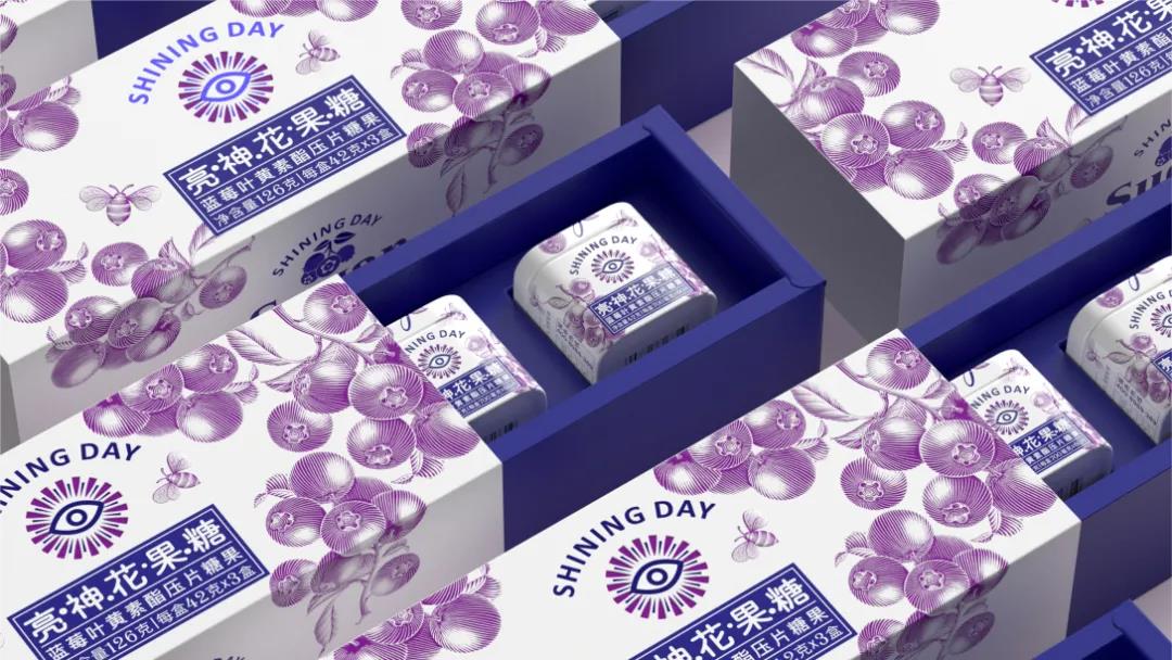 另外手繪插畫的風(fēng)格,呼應(yīng)了品牌所要追求的休閑感,并以藍(lán)紫雙色調(diào)的重疊碰撞,描繪出蜜蜂正在圍繞新鮮藍(lán)莓采蜜的畫面,表達(dá)出產(chǎn)品的口味特點(diǎn),對(duì)稱式布局盡顯天然美感。抽拉式禮盒設(shè)計(jì),節(jié)省了用戶開啟禮盒的時(shí)間,給予消費(fèi)者更舒適的感觀體驗(yàn)。最后產(chǎn)品的slogan,以“嚼一嚼”為視覺語言,激發(fā)消費(fèi)者對(duì)產(chǎn)品使用的好奇心理,讓護(hù)眼的過程也變得輕松、愉悅。