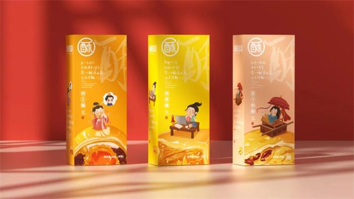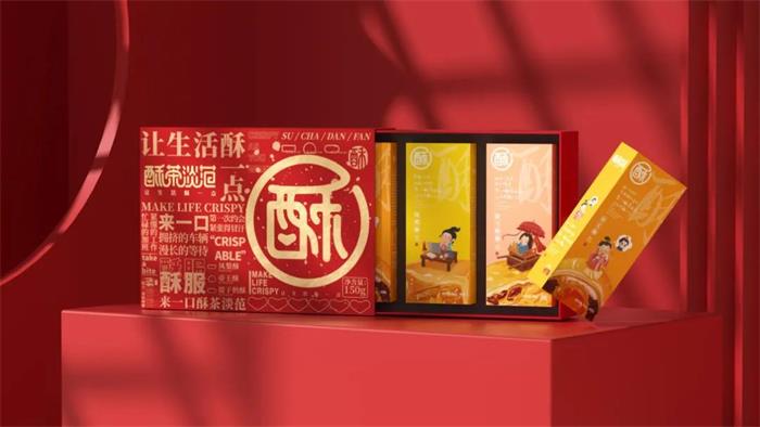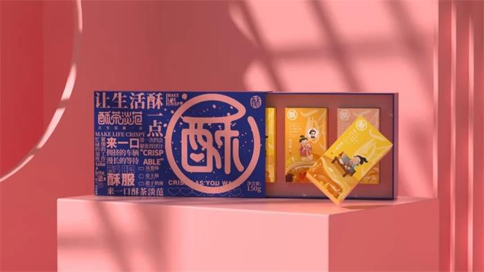 蘇州食品包裝設(shè)計(jì)禮盒分為紅、藍(lán)兩款主色調(diào)包裝,圖形化的“酥”字占據(jù)了大部分封面,柔軟的筆觸與裸粉色調(diào),形成品牌的視覺(jué)符號(hào)。左側(cè)則是滿版的產(chǎn)品賣(mài)點(diǎn)排版,重點(diǎn)突出“酥服”等俏皮文案,進(jìn)一步強(qiáng)化品牌調(diào)性,以直戳消費(fèi)者痛點(diǎn)的文字表達(dá),激發(fā)其購(gòu)買(mǎi)欲。抽拉式禮盒便捷易開(kāi),加之透明內(nèi)封的裝飾保護(hù),賦予包裝更多的收藏和送禮價(jià)值。內(nèi)盒獨(dú)立包裝將畫(huà)面定格在古代,古裝小人IP正在認(rèn)真工作、,乘轎外出或品嘗美食,并且將手繪插圖的蛋黃酥為“背景板”,寓意沉浸在美食的世界~