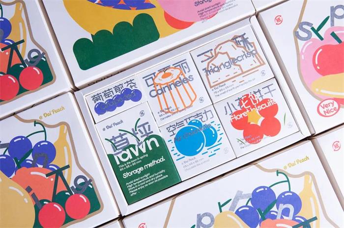 甜品禮盒整體呈現(xiàn)美式復(fù)古的油畫(huà)質(zhì)感,純白背景的基礎(chǔ)上以水彩插畫(huà)為主視覺(jué)設(shè)計(jì),并加入了梨子、櫻桃等水果元素,飽和暖色調(diào)的使用更易增加消費(fèi)者食欲。