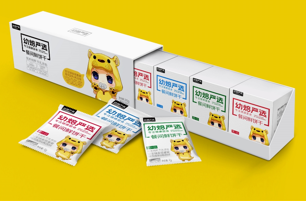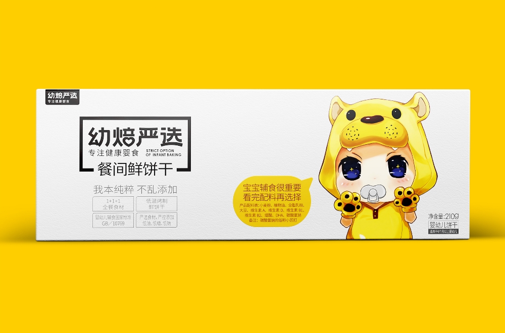此外,設(shè)計(jì)團(tuán)隊(duì)還創(chuàng)意了一個(gè)品牌IP——穿虎頭衣服的小寶寶。這個(gè)有親和力的形象能夠很好的引起消費(fèi)者對品牌的好感度,同時(shí)能夠很直觀的告訴消費(fèi)者這是一款嬰幼兒食品。